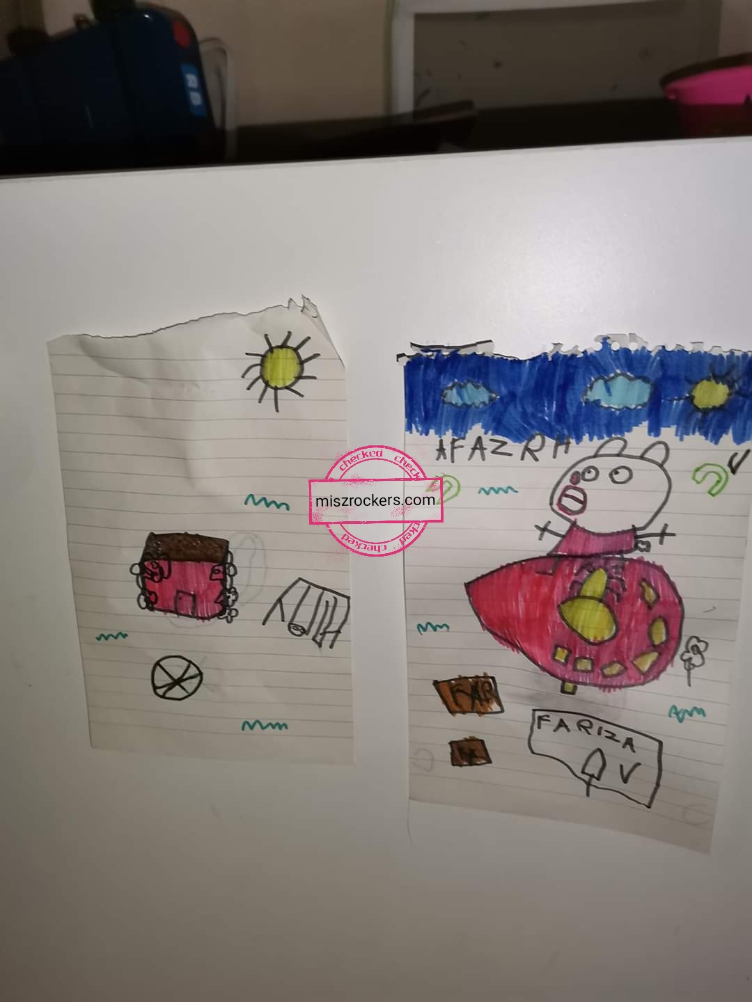 Terkejut haritu, dia tunjuk dekat nad, dia lukis rumah, kucing, pokok, dan baru-baru ni dia lukis salah satu watak dalam Peppa Pig. Ye cerita kartun dia. Tengokla hasil lukisan dia, 5 tahun dh pandai melukis macam ni. Setiap kali lukis, setiap tu dia mintak taml. Bagi nad ni dah cukup cantik ya. Nad sendiri tak reti la nak melukis sangat, nad memang tak suka seni-seni ni.. Hahhaa..